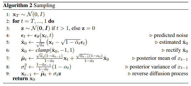 The reverse process uses the U-Net to predict $\epsilon_\theta(x_t,t)$ and reconstruct $x_0$ through the posterior mean: