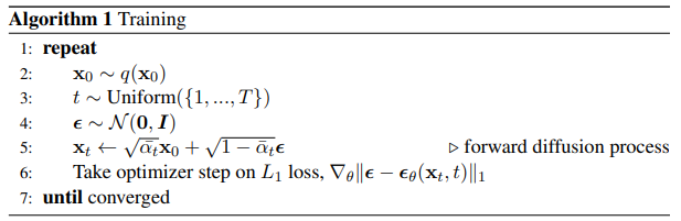 \(\mathcal{L} = \| \epsilon - \epsilon_\theta(x_t,t) \|_1\)