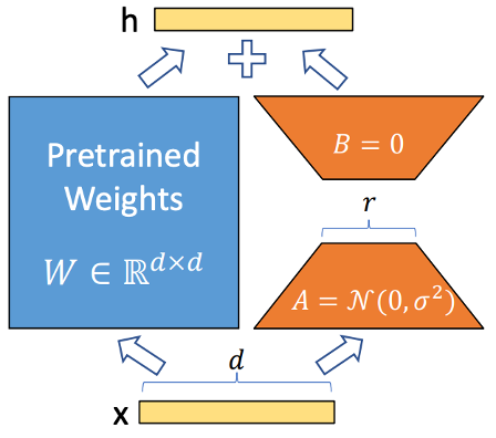 - Injected trainable low-rank matrices ($\Delta W = BA$) into attention projection layers