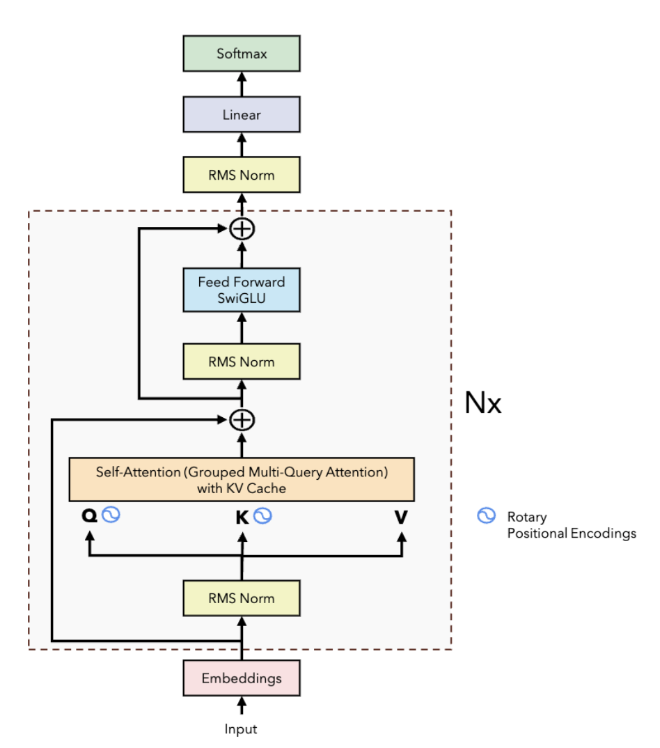 Figure 1: Llama2 Decoder-Only Transformer Architecture with GQA, RoPE, and SwiGLU